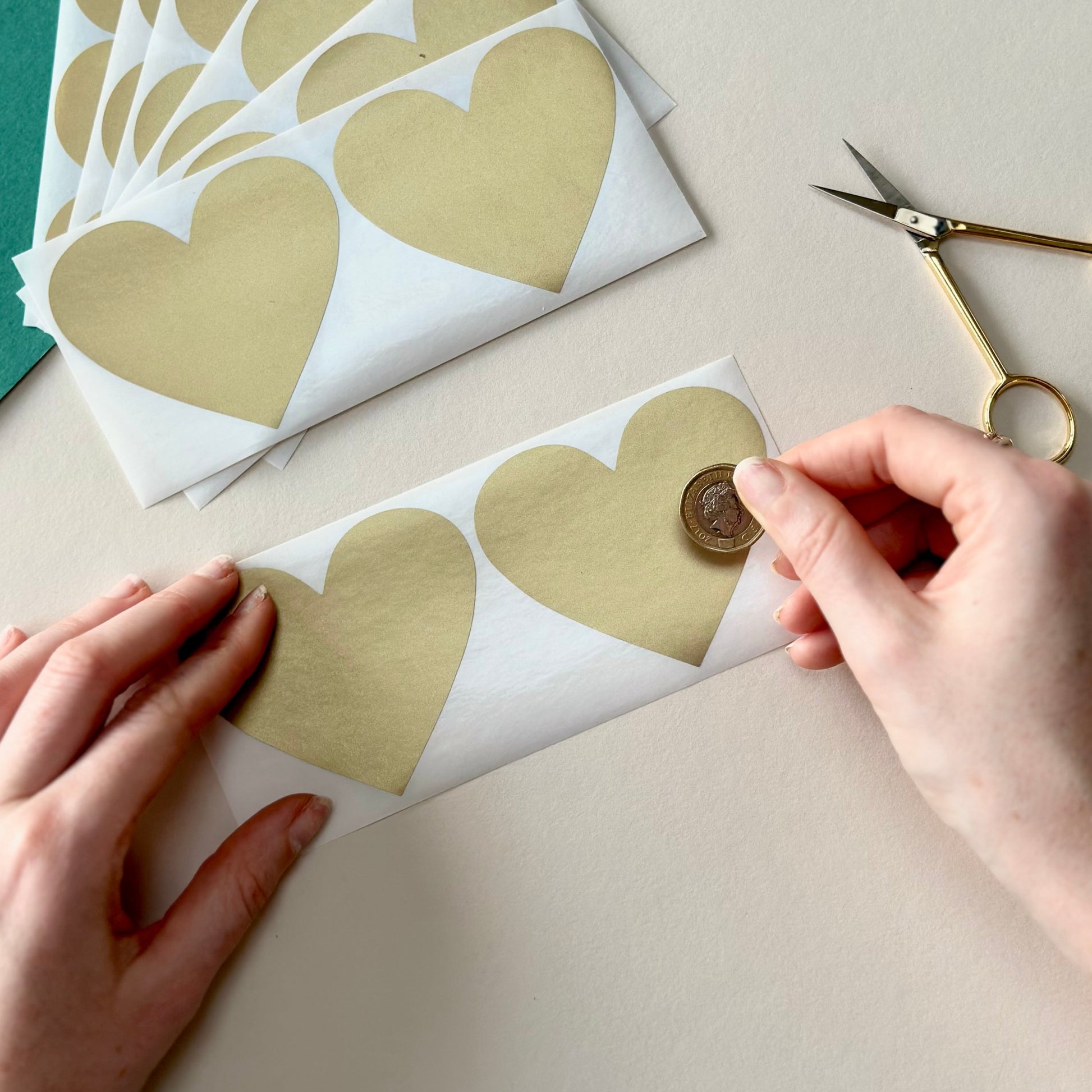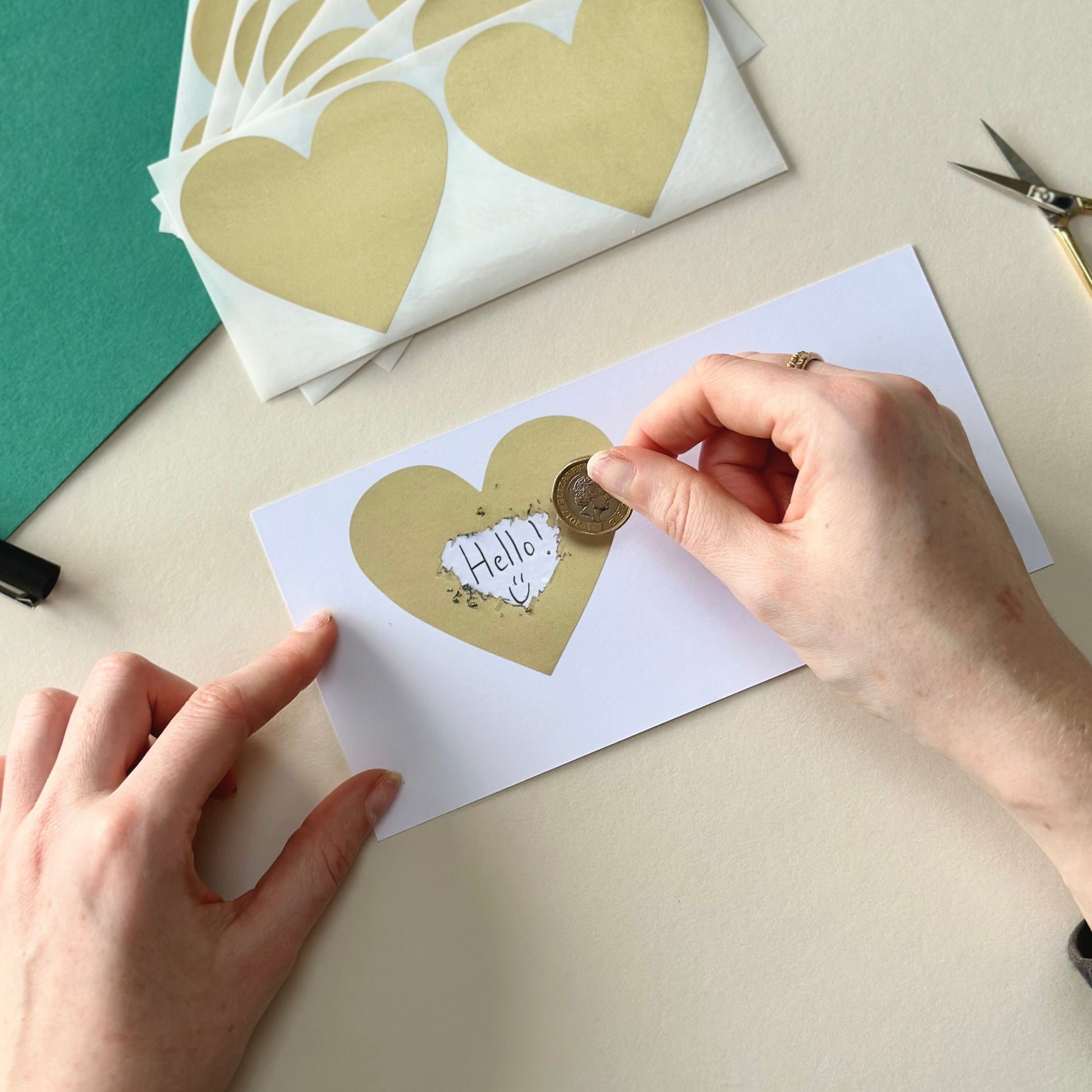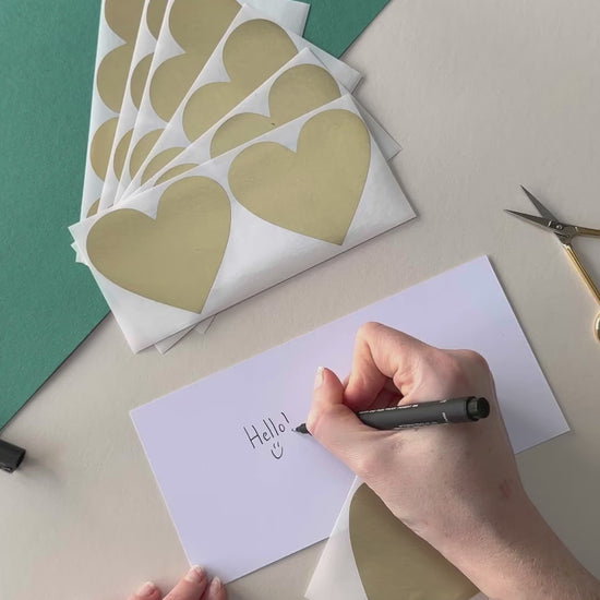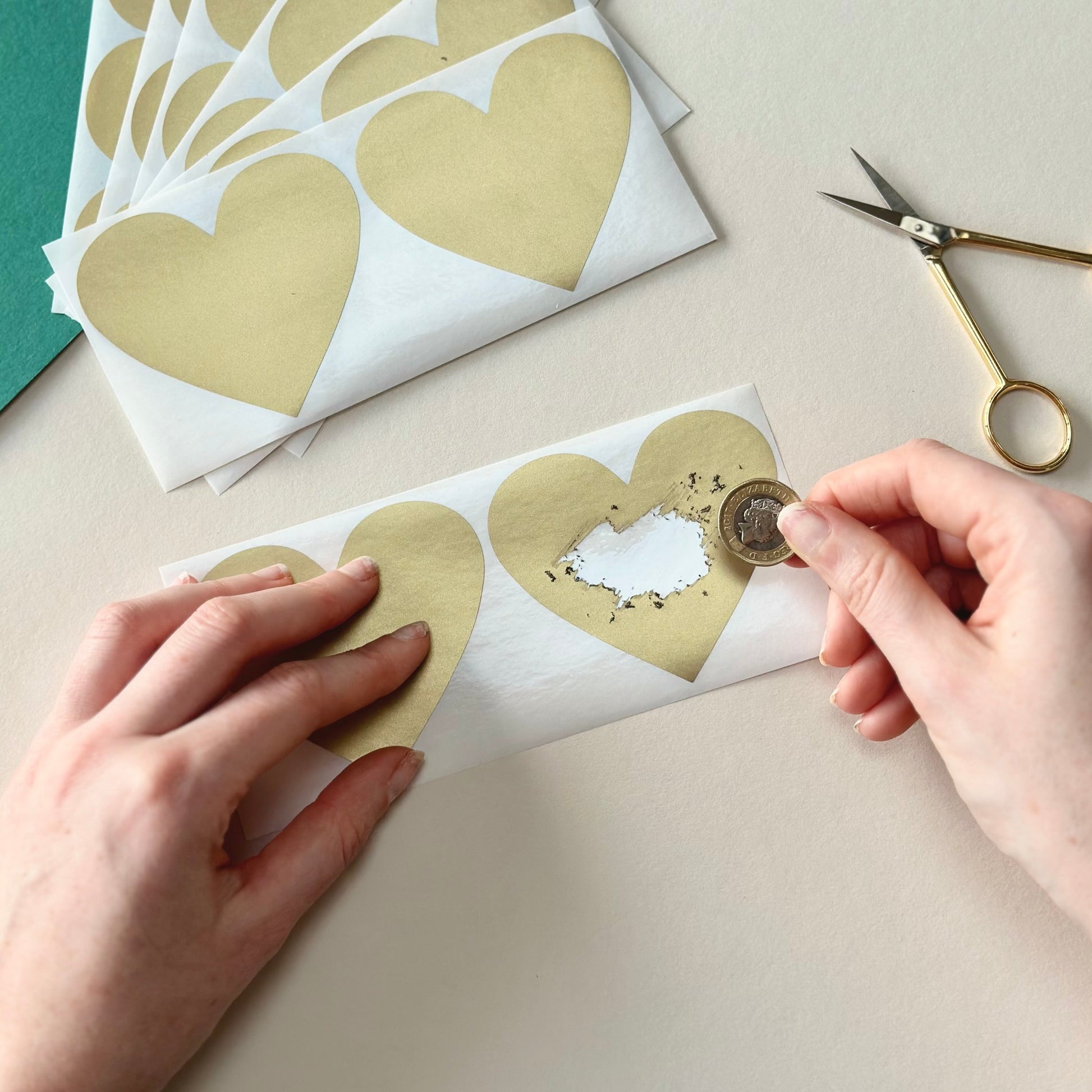 Gold heart scratch off stickers 70x80mm. These stickers are self-adhesive perfect for scratch to reveal goods.